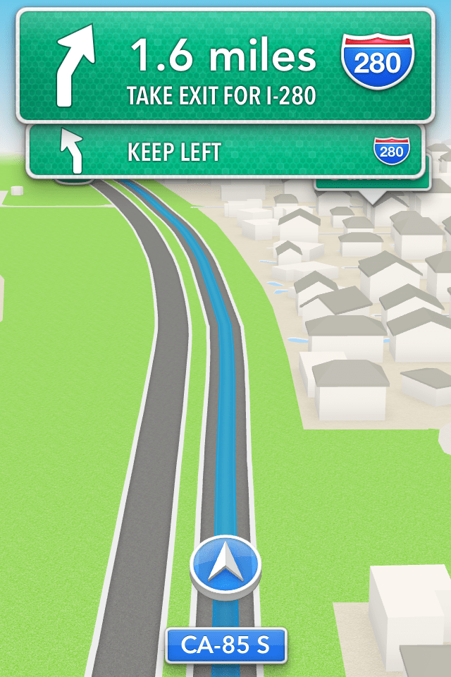 Each of the interstate, federal, state, and county highway shields are rendered in very crisp detail. That detail shows up on the large turn by turn directions as well as the map and satellite view. Apple does a good job at localizing the state signs for each state as well as using green background signs here and blue in Europe where that color is more commonly used. The 2D and 3D map views are very well rendered. In the third image, it’s easy to see this famous decreasing radius turn when merging from highway 12o east into highway 120/99 north. The call outs above the road seem to be a nice touch. It makes the map clearer to read. The 3D buildings on what is traditionally a 2D view moves the aesthetics forward..