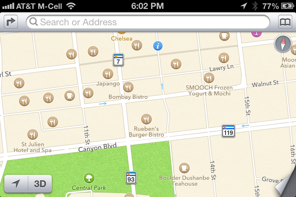 There are tons of images out on the web pointing out bugs in Apple’s data for the flyover view. Given that they are trying to map the entire world in high fidelity in the palm of your hand, there are bound to be bugs. I’ve found some on Google’s maps over the years (you couldn’t use street view to cross from Canada into Alaska). I’ve reported most of them and they have fixed them. Apple’s data is good for a first release. They don’t do near as well as Google polling their users for issues with the map data. The application is very performant (on the 4S) and the images render well. As you navigate from cities out to lesser populated areas, the images lose some fidelity, but that’s common with Google’s data as well.
