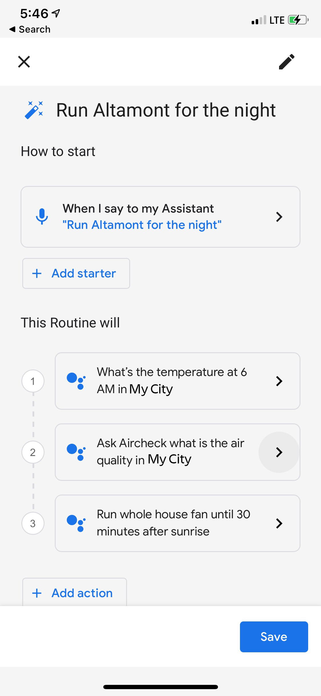 When I run the script, Google home lets me know the air quality, the temperature at 6 AM, and then kicks on the house fan. If the air quality isn’t good or it’s not cool enough during the night I can simply reply back “Hey Google, turn off the whole house fan.”